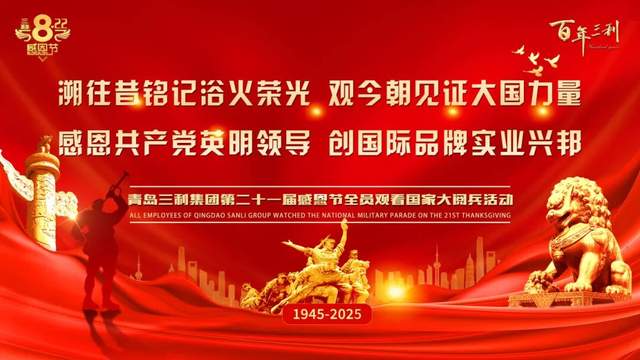 9月3日上午,紀(jì)念中國(guó)人民抗日戰(zhàn)爭(zhēng)暨世界反法西斯戰(zhàn)爭(zhēng)勝利80周年大會(huì)在北京天安門(mén)廣場(chǎng)隆重舉行。青島三利集團(tuán)積極響應(yīng),在集團(tuán)總部及C區(qū)產(chǎn)業(yè)園組織全體員工同步觀看閱兵直播盛況。分布在全國(guó)各地的營(yíng)銷和安裝人員也通過(guò)視頻連線的方式,共同見(jiàn)證了這一歷史時(shí)刻。