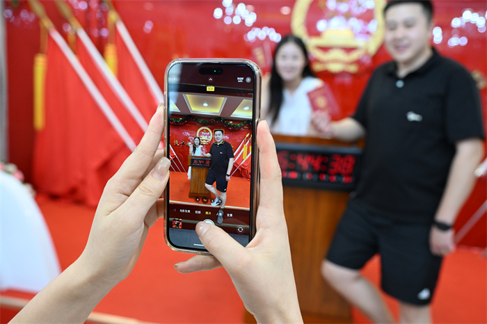 即墨區(qū)民政局婚姻登記處到處洋溢著幸福的氣息,祝福這一對(duì)對(duì)新人都能夠白頭偕老,幸福地生活下去。喜氣洋洋的頒證廳、浪漫唯美的網(wǎng)紅打卡角、隨處可見的喜字與拉花……在婚姻登記處,領(lǐng)證后拍照留念的新人隨處可見,對(duì)他們來說,七夕是象征愛情的節(jié)日,象征著乞巧,祈愿,企盼婚姻幸福甜蜜,圓圓滿滿。